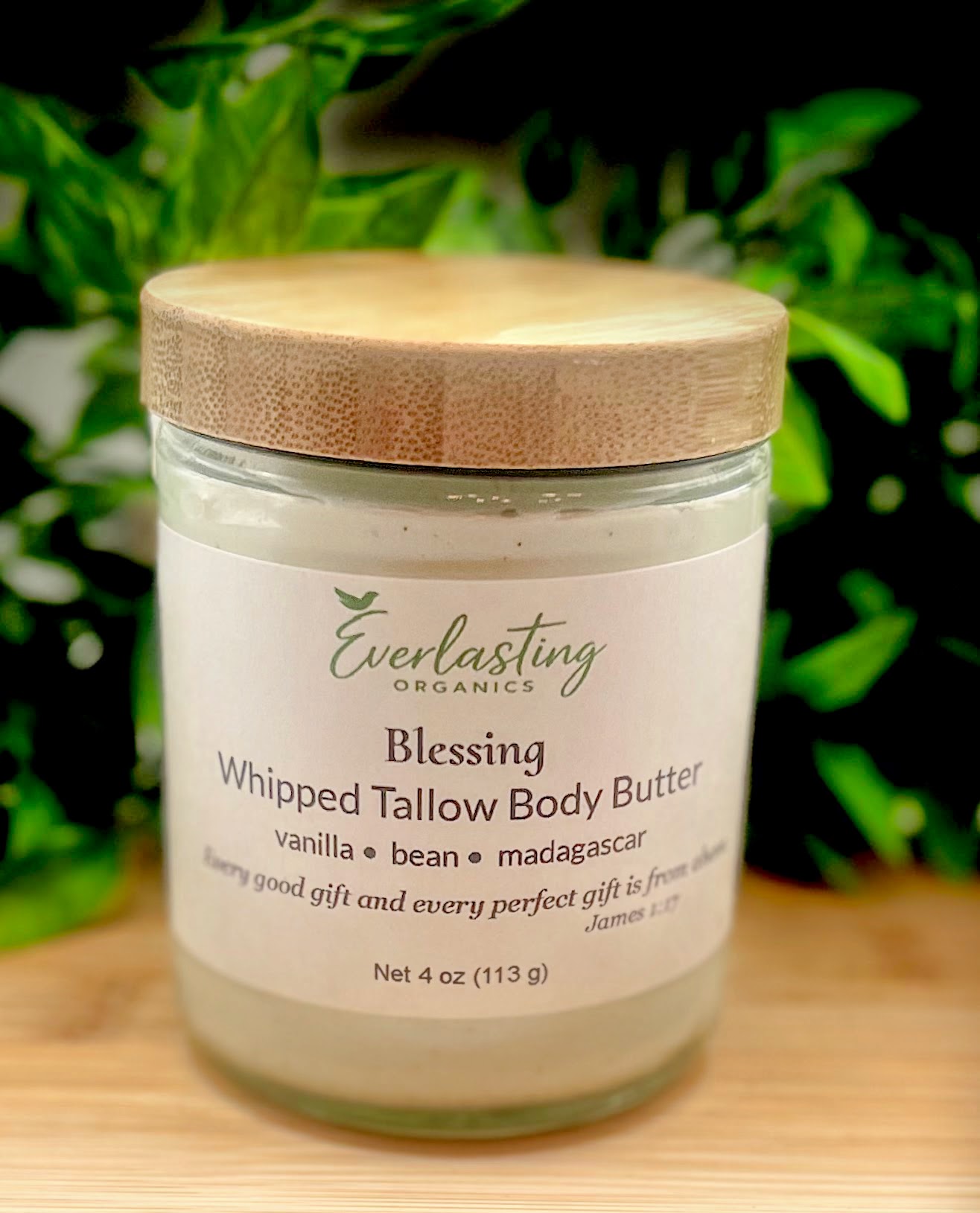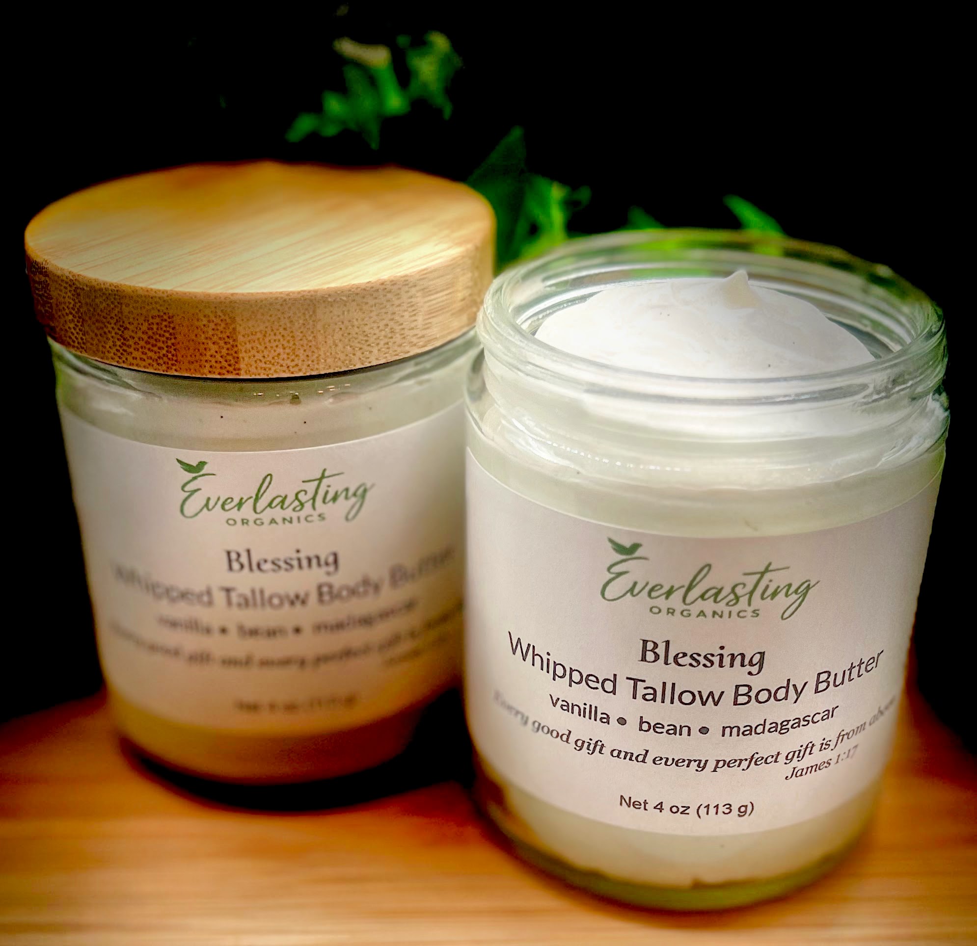 The one we can never keep in stock. Blessing is a slow-crafted, 24-hour warm-infused whipped tallow body butter kissed with real Madagascar vanilla bean — visible in every swipe. Sold by weight, not by jar: a full, honest 4 oz (113 g) in a generously sized 8 oz glass jar, because a truly whipped texture needs room to breathe. Skin-identical. Deeply nourishing. Entirely non-toxic.